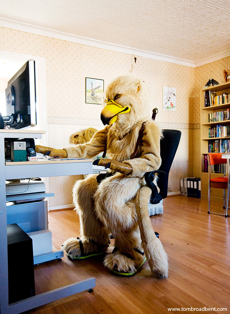 Akil Tawnybird, a wingless Gryphon in his living room. By day, Akil works as a technican and describes himself as a part-time Gryphon. Of fur-suiting he says” You can get out of your shell more because no one knows you. It’s just a laugh, a bit of fun”